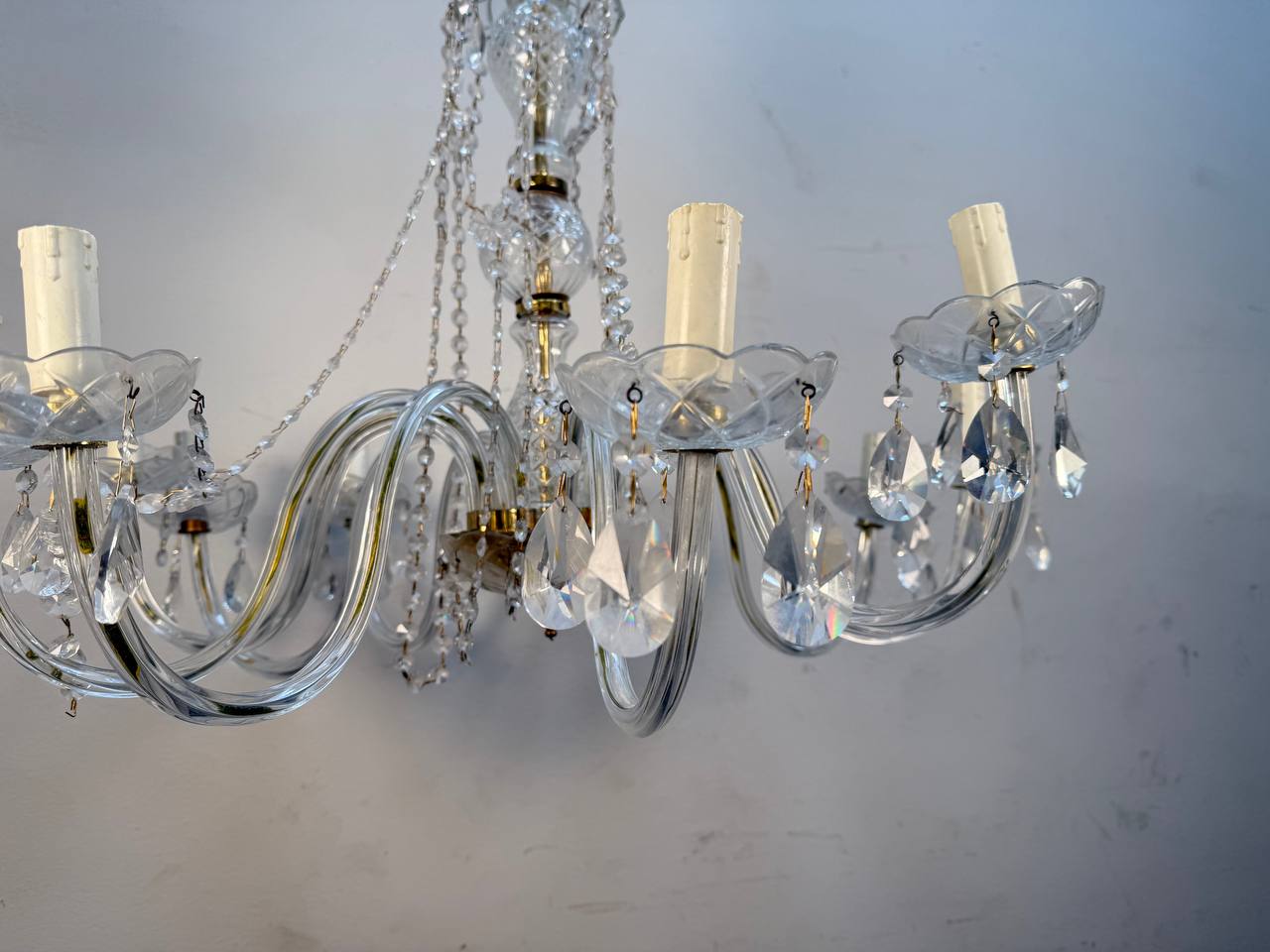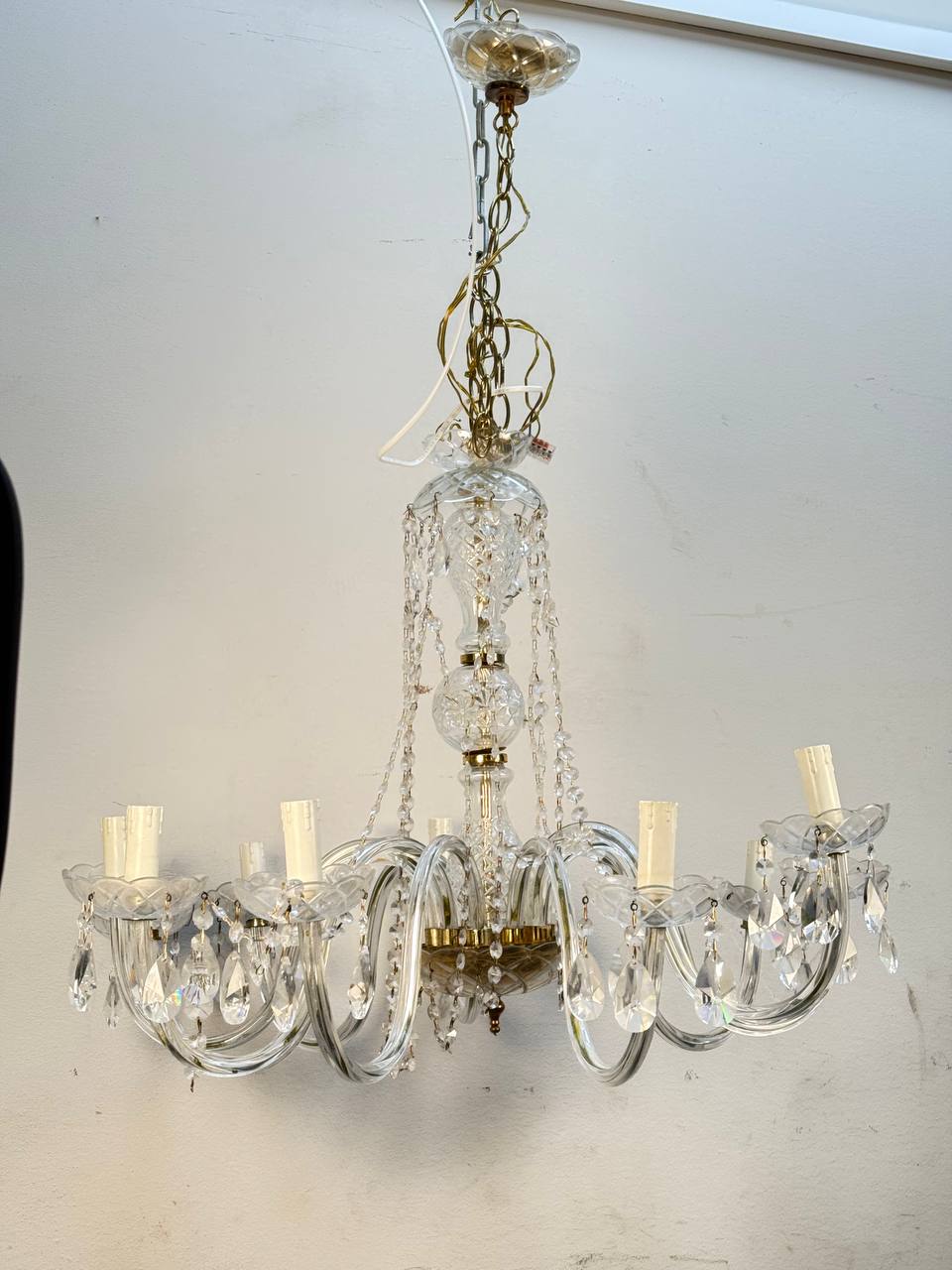 Люстра хрусталь/стекло/латунь в классическом итальянском стиле на 10 ламп. Размер 80 размах, 60 высота без цепи и цепь еще 80 см. Подвесы повесил не все и надо на свой вкус
